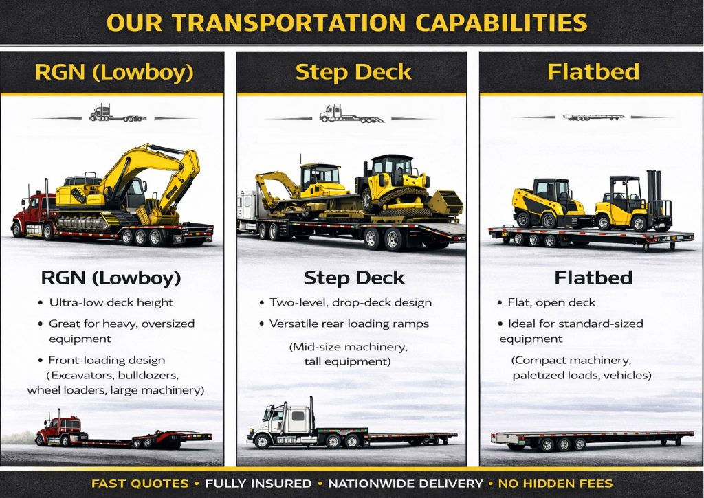 We offer affordable nationwide shipping using specialized trailers matched to your equipment’s size and weight:
